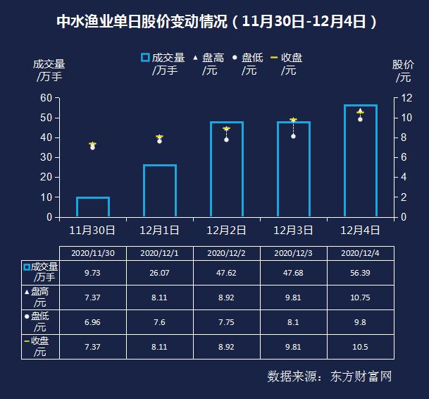 数据显示,12月3日午后,渔业板块接续走强,邦联水产(300094.SZ)、大湖股份(600257.SH)、獐子岛(002069.SZ)等跟涨。当日13时40分,中水渔业涨停,收盘价为9.81元/股,成交量47.68万手,成交额4.33亿元,振幅19.17%,换手率14.93%。这也是中水渔业六日内第五个涨停。