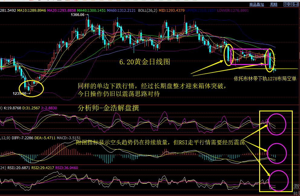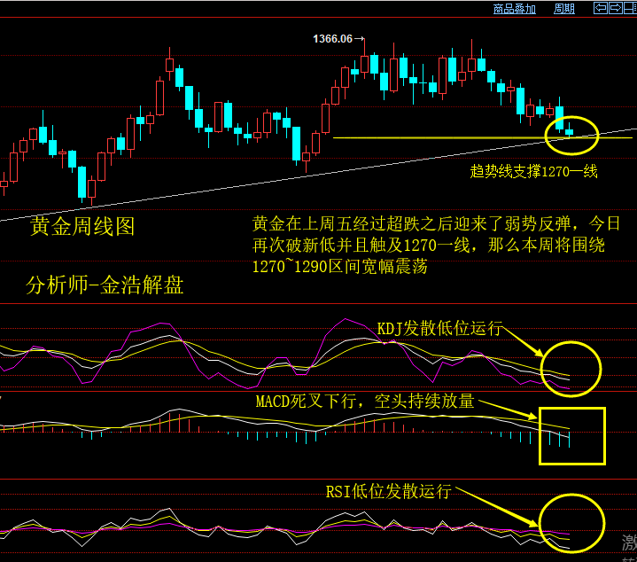黄金周线收大阴线,金价曾经刺破布林带下轨维持1278一线,金价跌破各均线目标并偏离均线一线,超跌之后将迎来反弹纠正,因为K线偏离均线目标过远,下方空间不会太大,本周将环绕1270~1290宽幅振撼,至于振撼的年华咱们不得而知,附图目标上KDJ处于低位运转,三线死叉发散,MACD疾慢线死叉即将步入零轴下方,空头绿色动能柱仍正在一连放量,RSI与KDJ同步走势,大周期目标上的趋向还是是空头趋向。