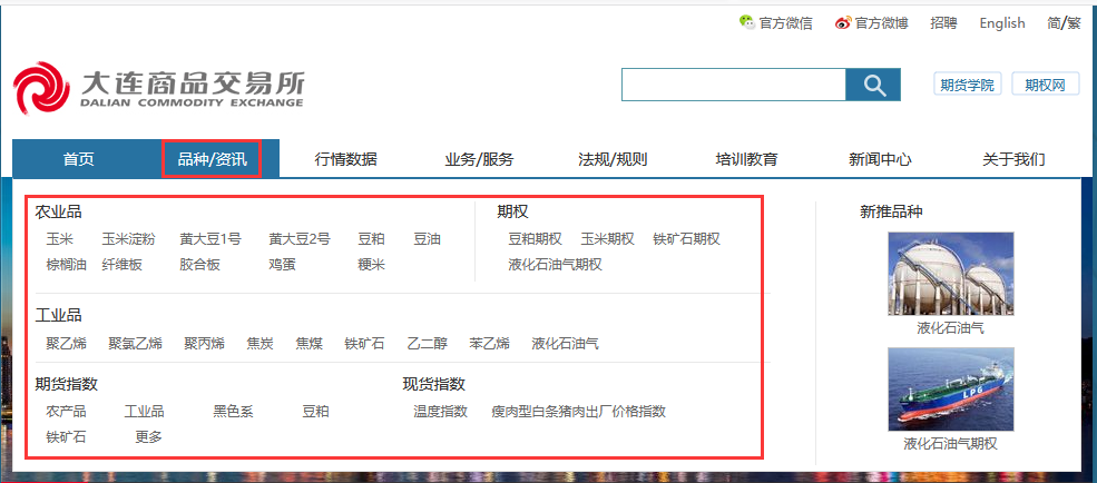 目前已上市玉米、玉米淀粉、粳米、黄大豆1号、黄大豆2号、豆粕、豆油、棕榈油、鸡蛋、纤维板、胶合板、线型低密度聚乙烯、聚氯乙烯、聚丙烯、乙二醇、苯乙烯、焦炭、焦煤、铁矿石、液化石油气共计20个期货种类和豆粕、玉米、铁矿石、液化石油气4个期权种类。