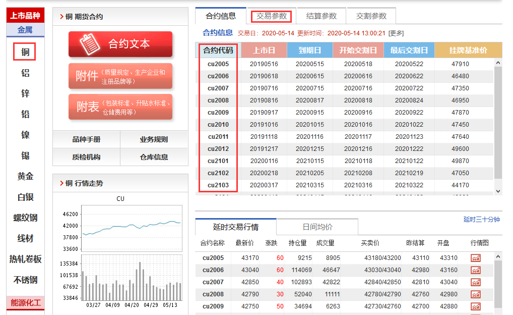 点击上面网址,进入后,正在左边点击各业务种类,好比我这里挑选铜,右边能够看到铜的业务种类前缀是cu,cu2005的乐趣是2020年5月到期的铜的期货合约。