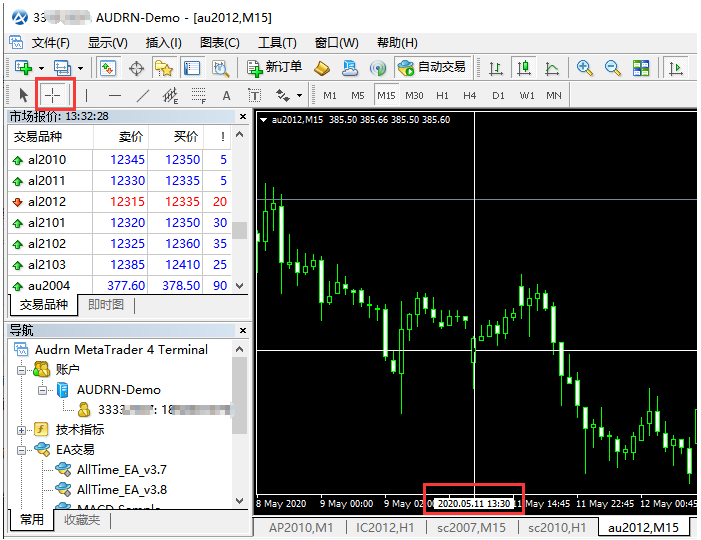 按鼠标滚轮或下图中的十字星按钮,然后把周期调到15分钟,就能够看到每根K线的开盘时代,从而分明这个业务种类每天的的确业务时段。