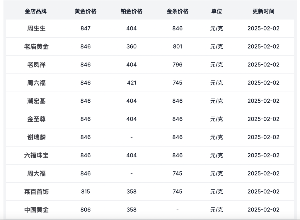2月2日,邦内众家黄金珠宝品牌足金首饰价钱已达846元/克。周生生当日公然的境内价钱最高,为847元/克,周大福、老庙黄金、六福珠宝、老凤祥、潮宏基、谢瑞麟等黄金珠宝品牌颁发的境内足金首饰价钱均为846元/克。