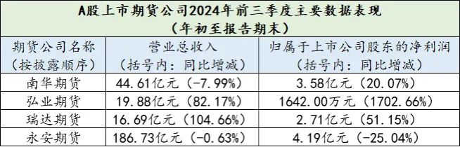 据《邦际金融报》记者统计,南华期货、弘业期货、瑞达期货、永安期货4家A股上市期货公司2024年前三季度合计实行开业总收入267.91亿元,合计实行归属于上述公司股东的净利润总额为10.64亿元。