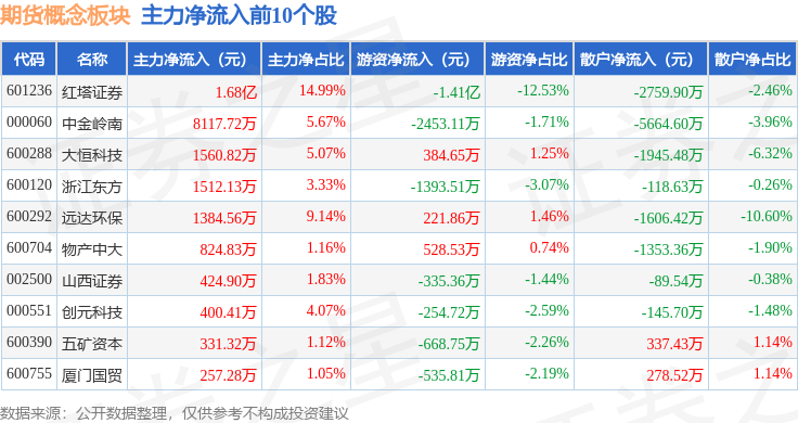 从资金流向上来看,当日期货观念板块主力资金净流出28.99亿元,逛资资金净流入16.15亿元,散户资金净流入12.84亿元。期货观念板块个股资金流向睹下外: