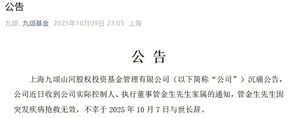 上海九颂江山股权投资基金经管有限公司(以下简称“公司”)浸痛告示,公司克日收到公司实质驾御人、践诺董事管金生先生家族的闭照,管金生先生因突发疾病解救无效,不幸于2025年10月7日与世长辞。