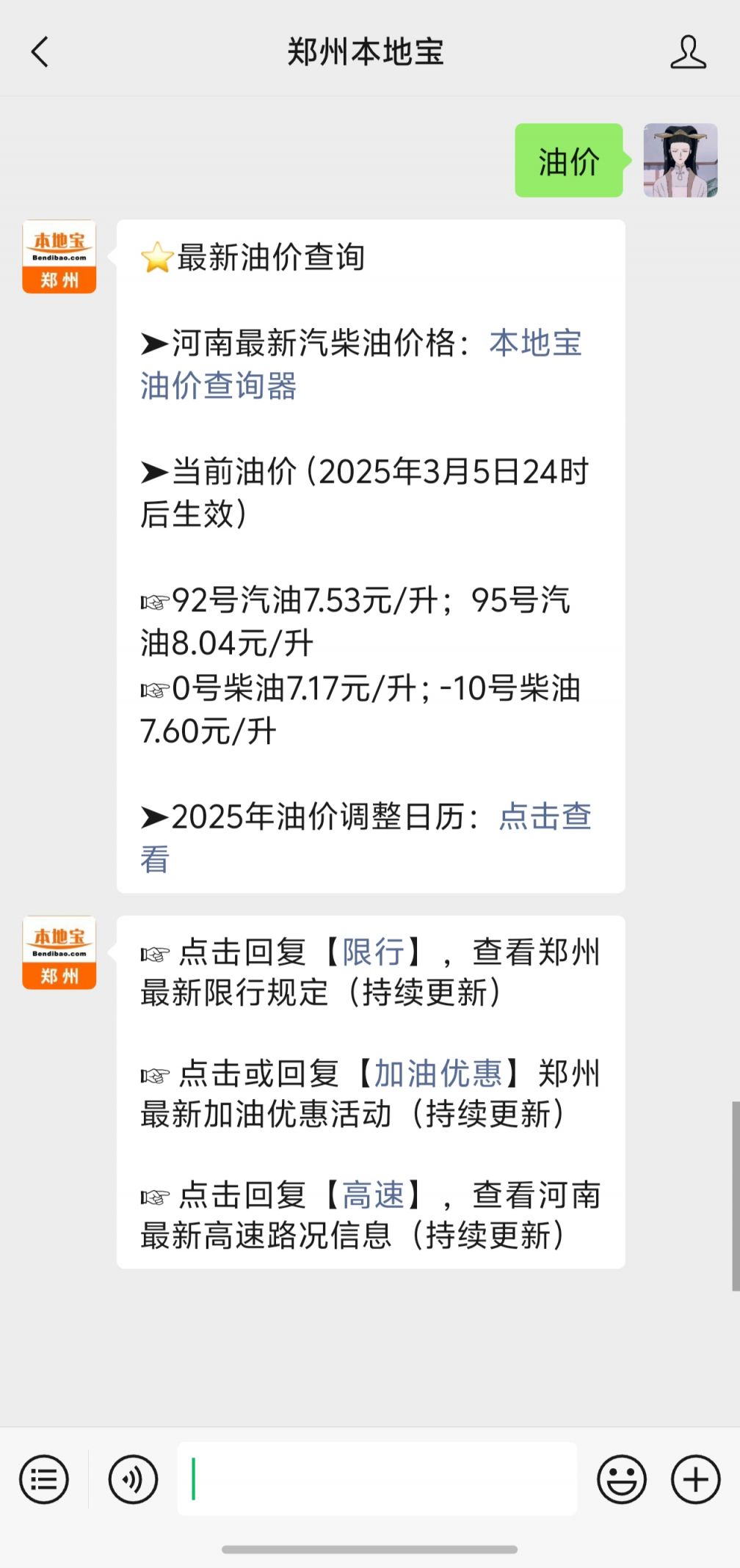 温馨提示:微信征采群众号【郑州当地宝】,合怀后恢复【油价】,即可查问河南省最新油价、了然涨跌趋向、获取加油优惠。油价安排后,郑州当地宝会正在第临时间举办更新。