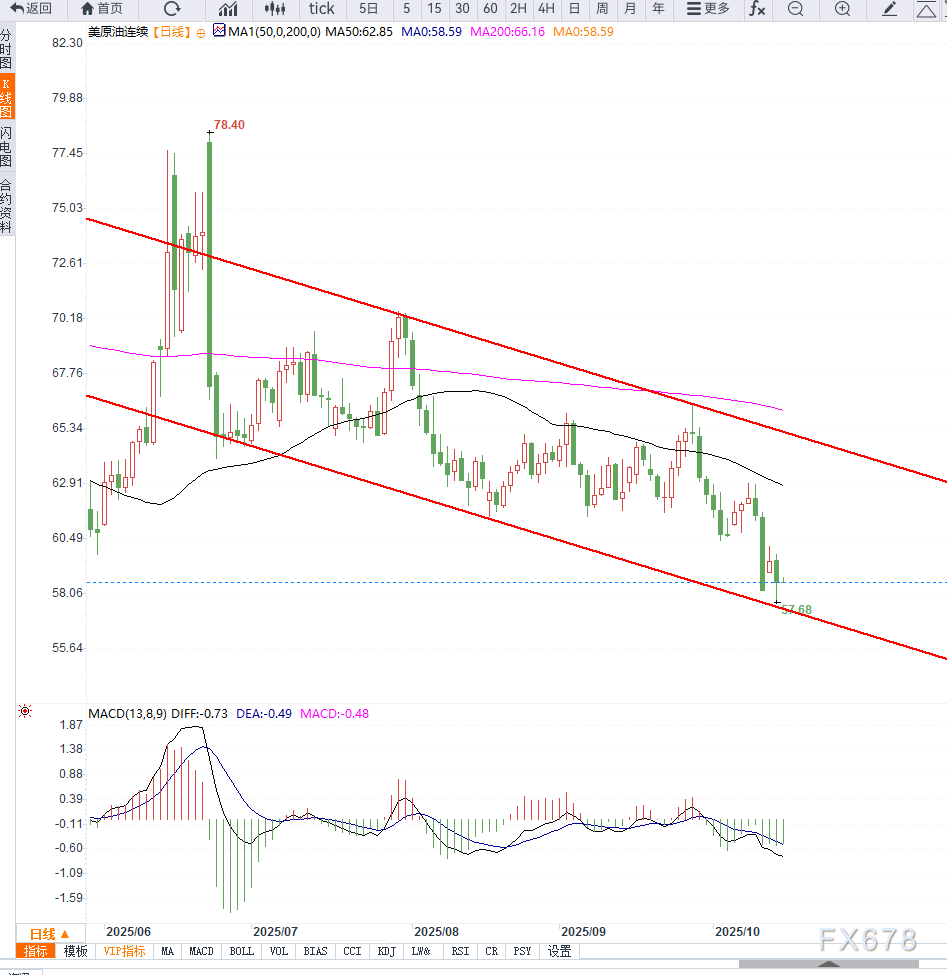 日线图形来看,价钱已陆续数日运转正在首要均线下方,浮现显明的空头分列格式。眼前WTI交投于58美元相近支柱区间,若该价位被有用跌破,下一方针或指向56.40美元区域,为前期底部支柱带。