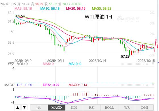 原油短线H)走势轰动下跌再革新低,触及57.30。均线体系发散向下且压制油价,短线客观趋向宗旨向下。早盘油价自底部反弹,从力度上相对弱势,MACD目标正在零轴下方运转,空头动能仍占上风,估计日内原油走势将轰动下跌运转为主。