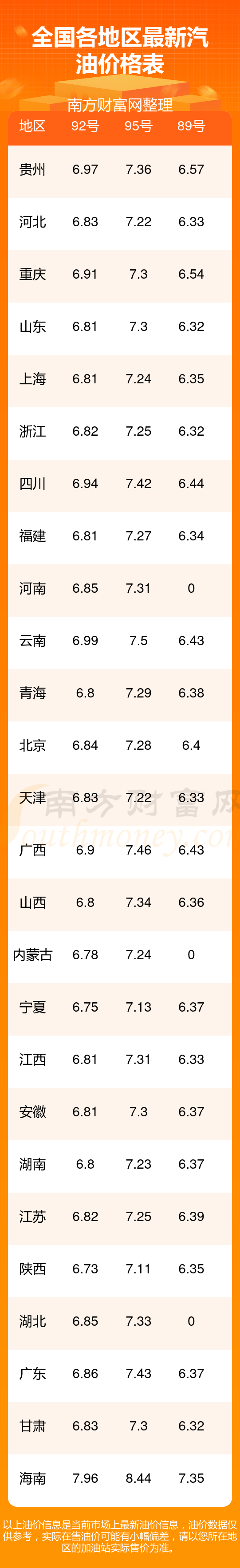 本轮油价调剂岁月为10月28日 ,调剂后寰宇油价详情为: 寰宇92号汽油均匀价值为:7元每升,个中,最低为陕西,价值6.73元/升,最高为海南,价值7.96元/升。 寰宇95号汽油均匀价值为:7元每升,个中,最低为陕西,价值7.11元/升,最高为海南,价值8.44元/升。